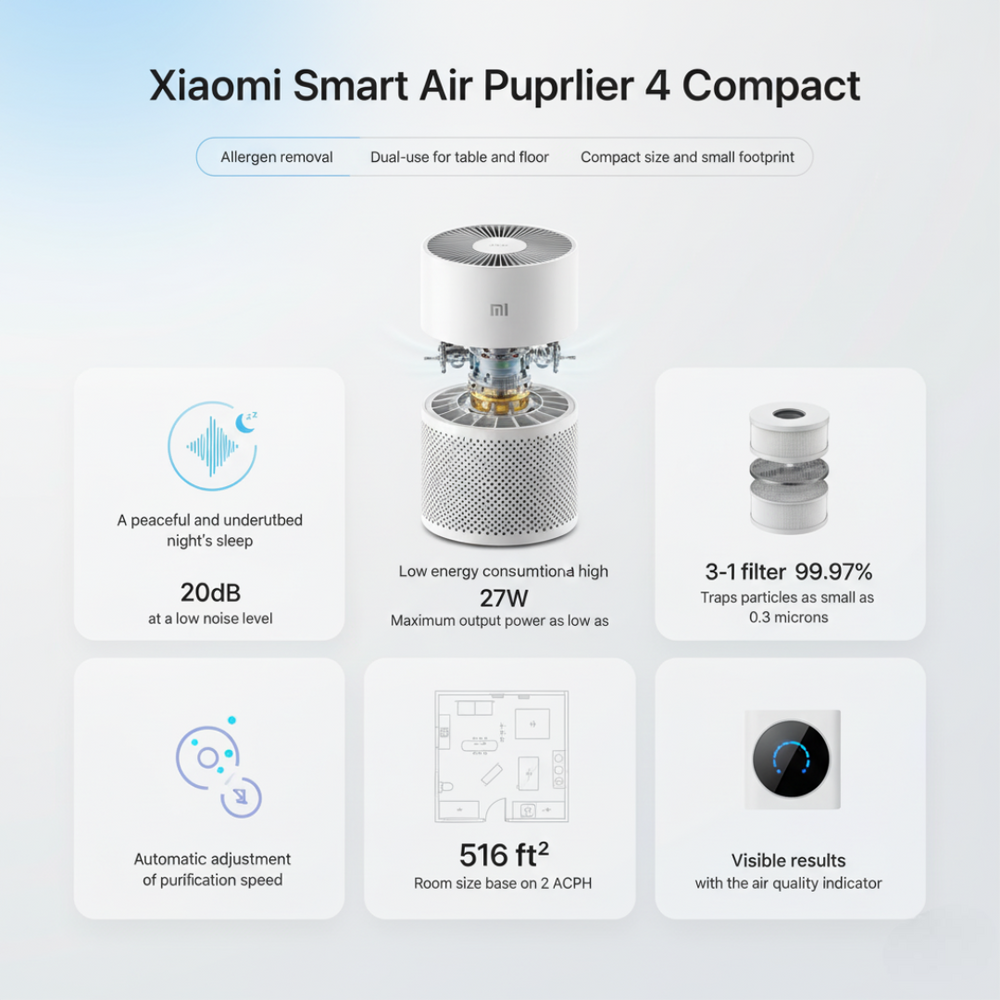 The Xiaomi Smart Air Purifier 4 Compact is designed to bring fresh, clean air into every corner of your home. With powerful allergen removal technology, it effectively captures dust, pollen, and pet dander, creating a healthier environment that is ideal for allergy-sensitive people.